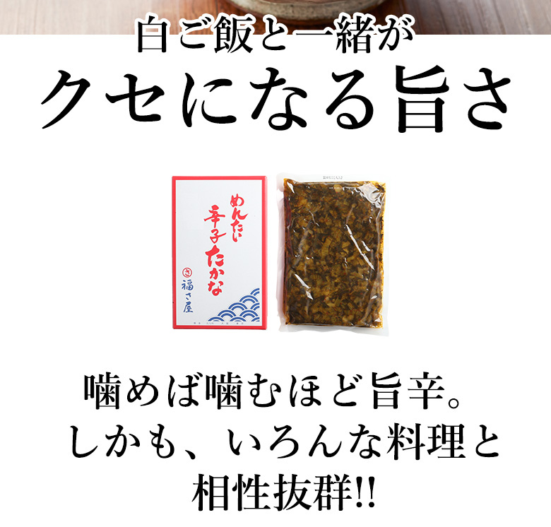 博多土産としても人気の辛子高菜を福さ屋の辛子めんたいと和えました。ちょっとしたおかずやお酒のおつまみにも大活躍です。