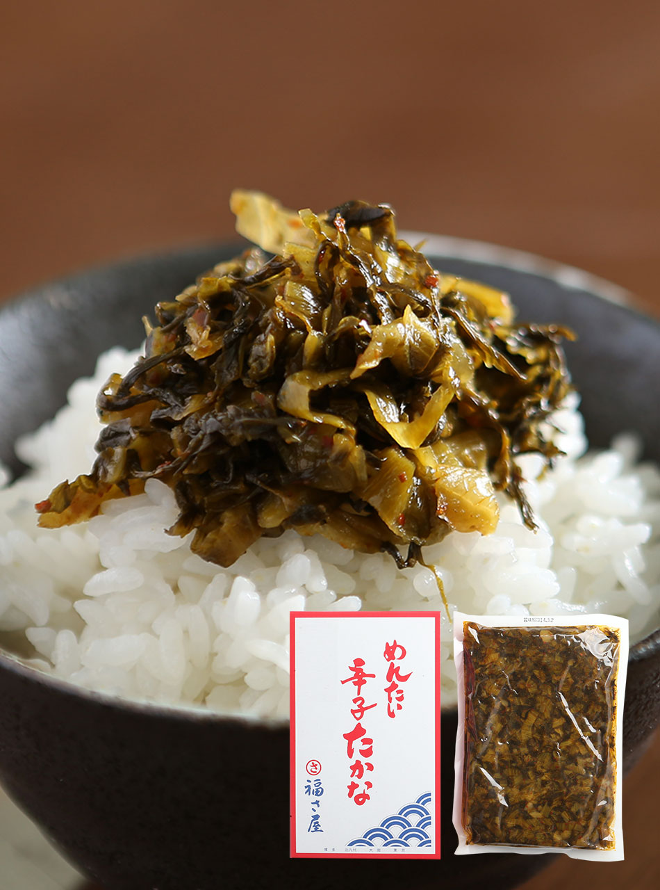 博多土産としても人気の辛子高菜を福さ屋の辛子めんたいと和えました。ちょっとしたおかずやお酒のおつまみにも大活躍です。