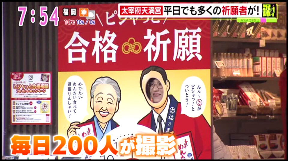 「深オイ」のコーナーで、太宰府天満宮の仁若屋に設置された福さ屋の「ピシャっと合格祈願パネル」に観光客の方々が顔ハメする様子などが紹介されました。